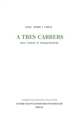 En 1968 la Diputación de València publicó A tres carrers, poemario con el que Anfós Ramon i Garcia (València, 1924-2014) ganó el premio València de Literatura-Poesía 1963, que otorgaba la entidad provincial. La obra está estructurada en tres partes: «El carrer de tots», «El meu carrer» y «El carrer de Déu». Con motivo de la celebración del centenario del nacimiento del escritor de Russafa, la Institució Alfons el Magnànim ha realizado una reedición facsímil de la impresa en 1968 por la Imprenta Provincial.