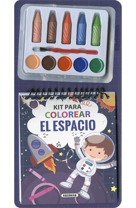 Fantástico kit con ceras y acuarelas para colorear láminas con ilustraciones del espacio.